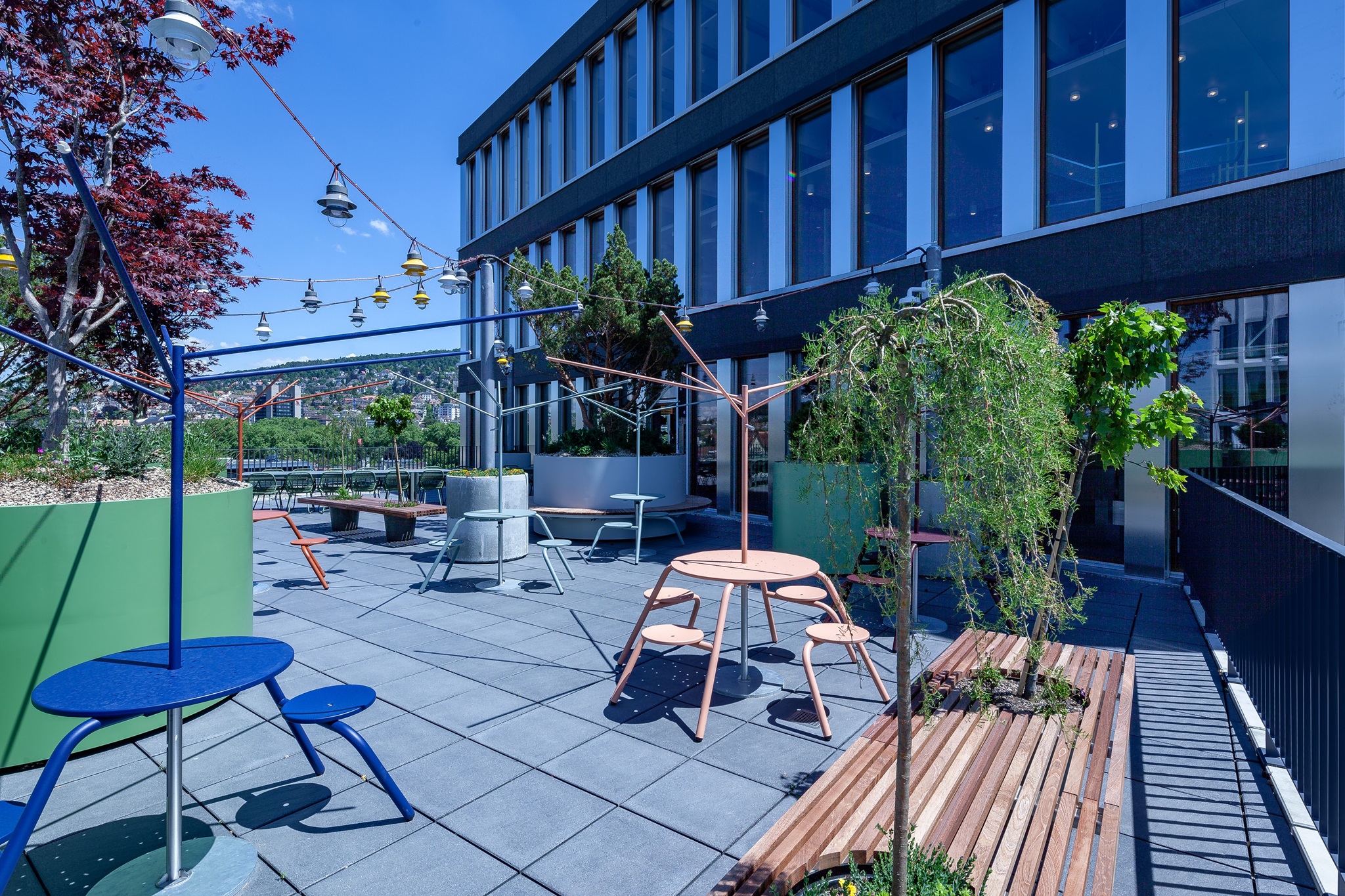 Auf der Dachfläche im 2 Obergeschoss sowie im Innenhof des 1 Untergeschosses entstand eine grüne Oase.