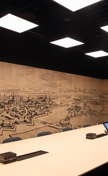 - Eingangshalle mit Lobby und Bibliothek. (50'000 Bücher)